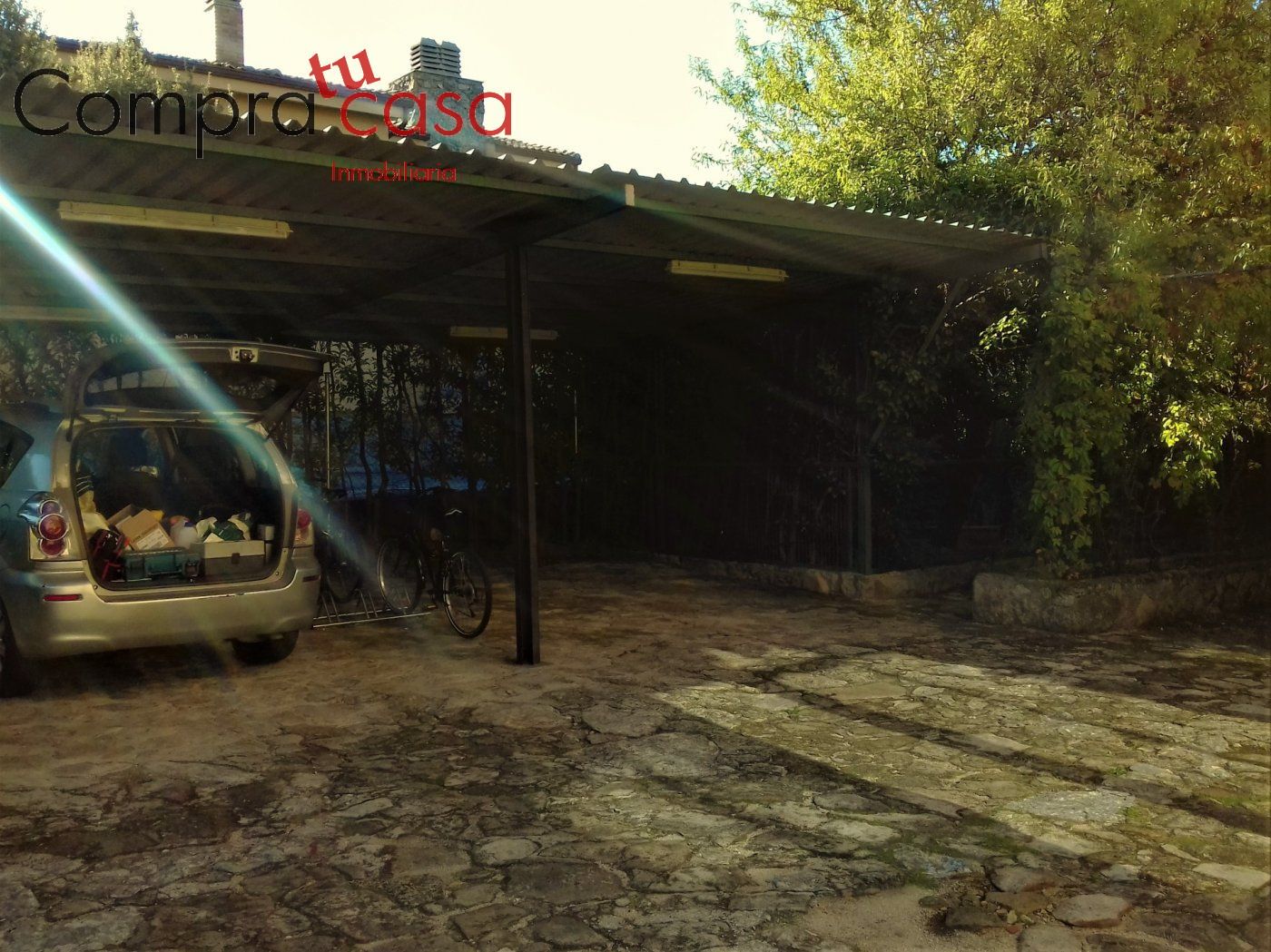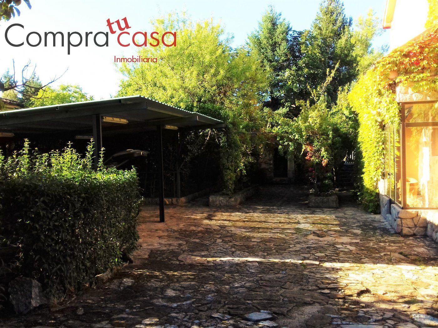 Amplia entrada, donde nos encontramos la zona de aparcamiento con pérgola para cuatro vehículos y el acceso principal a la vivienda, aunque esta cuenta con otra entrada por la parte trastera de la misma.