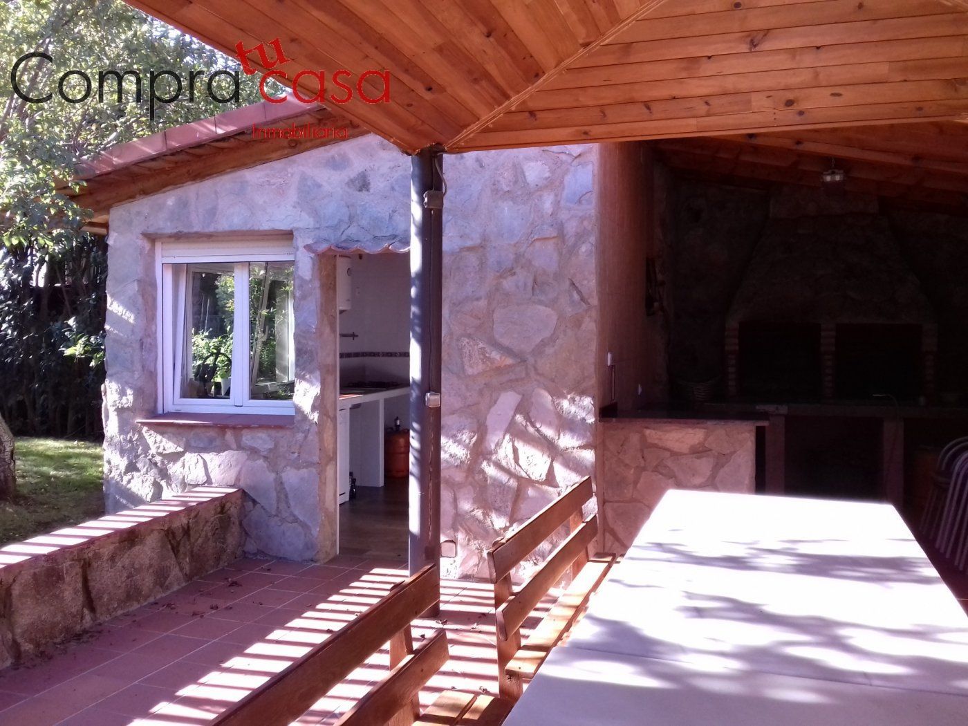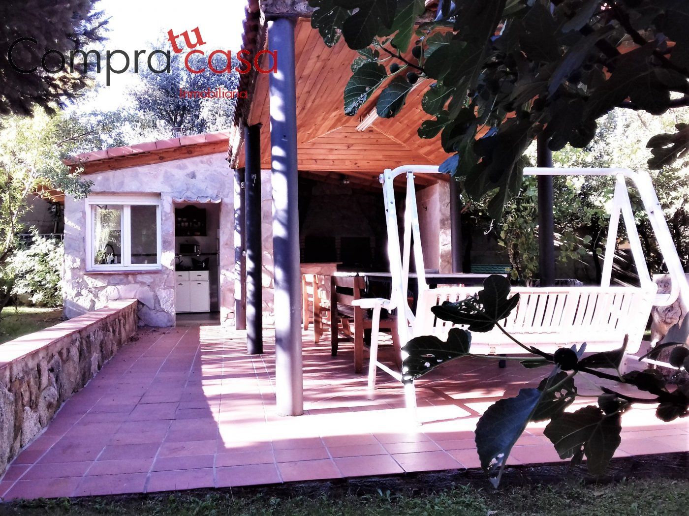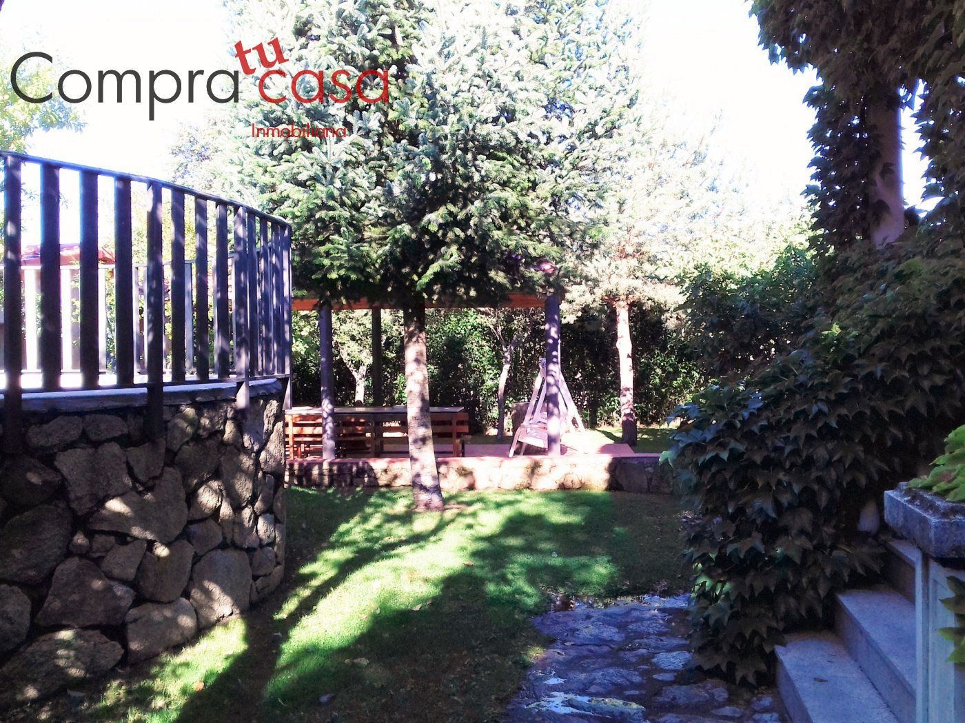 Toda la zona exterior que rodea el chalet está acabado con piedra, distintos tipos de plantas, zonas de descanso bien distribuidas, así como construcciones anejas para distintos usos.