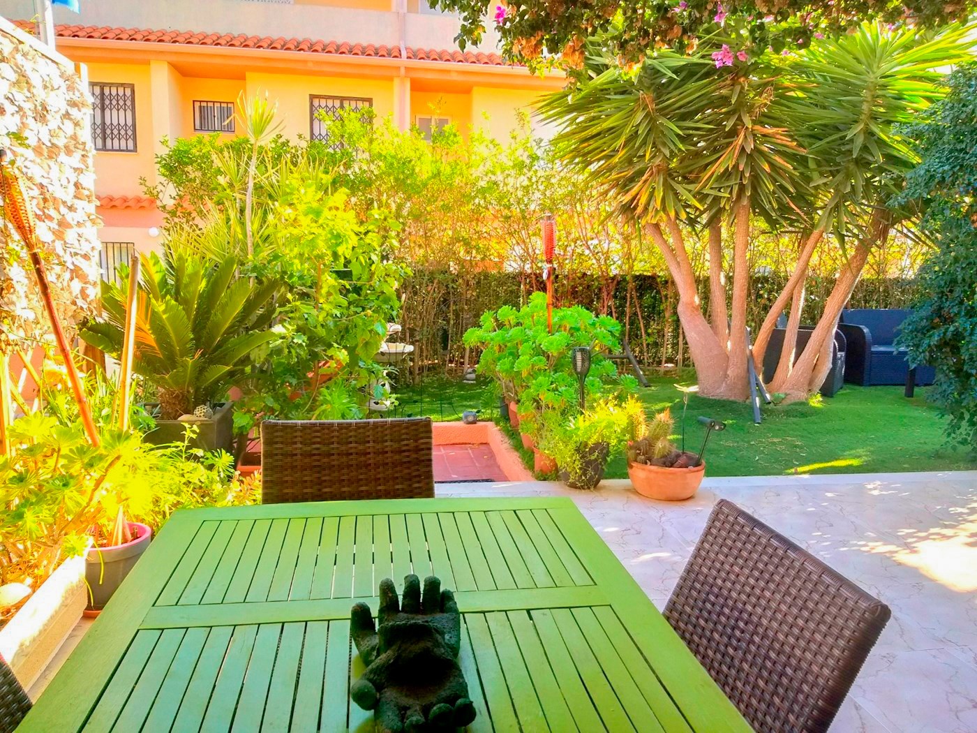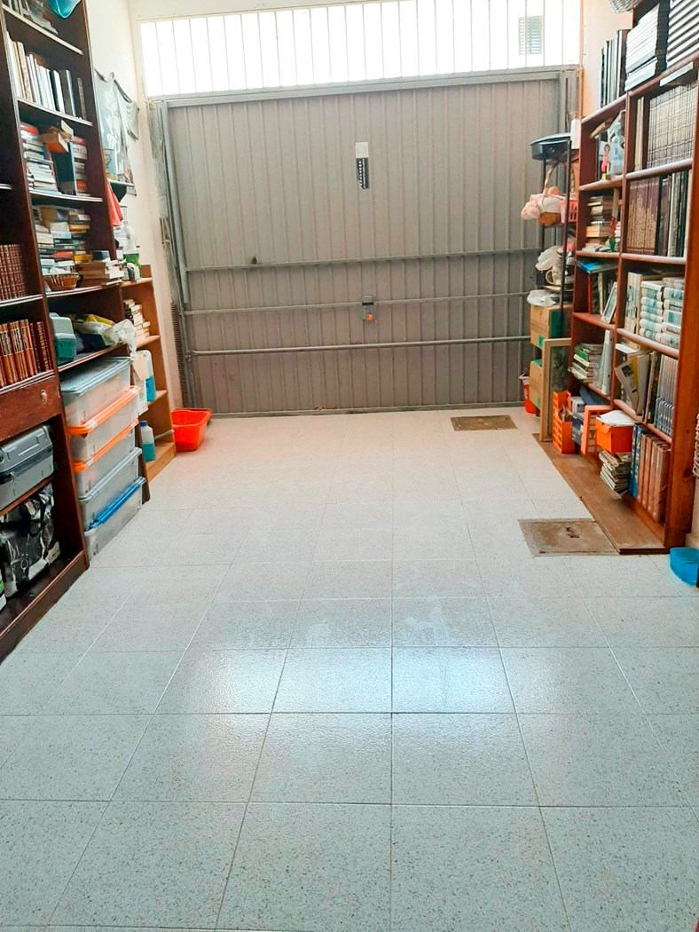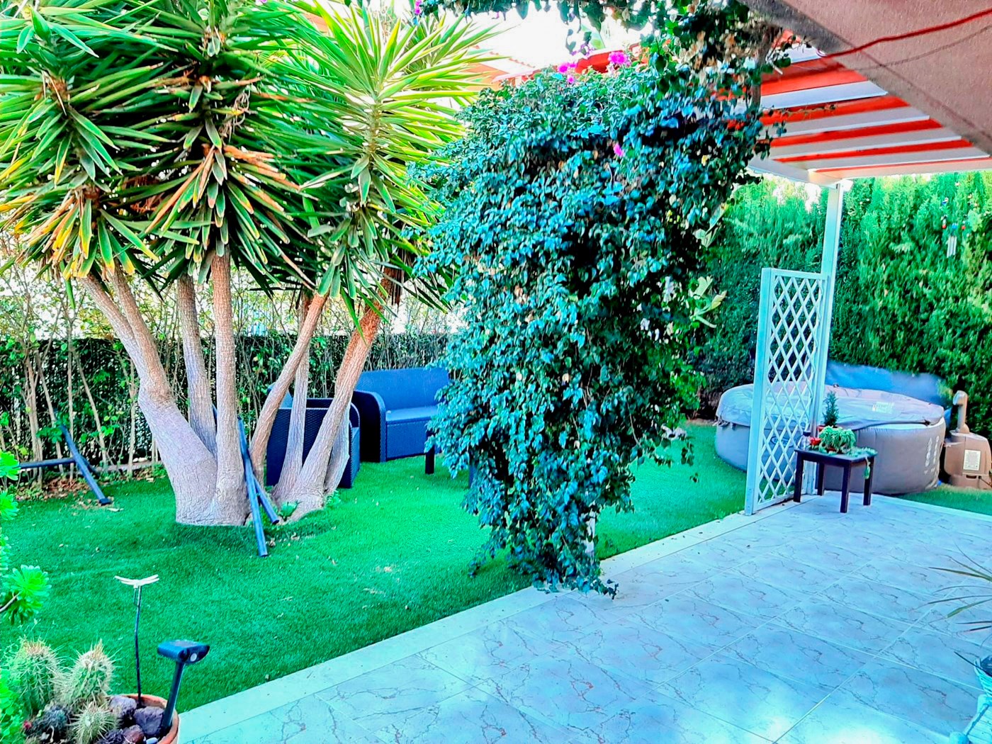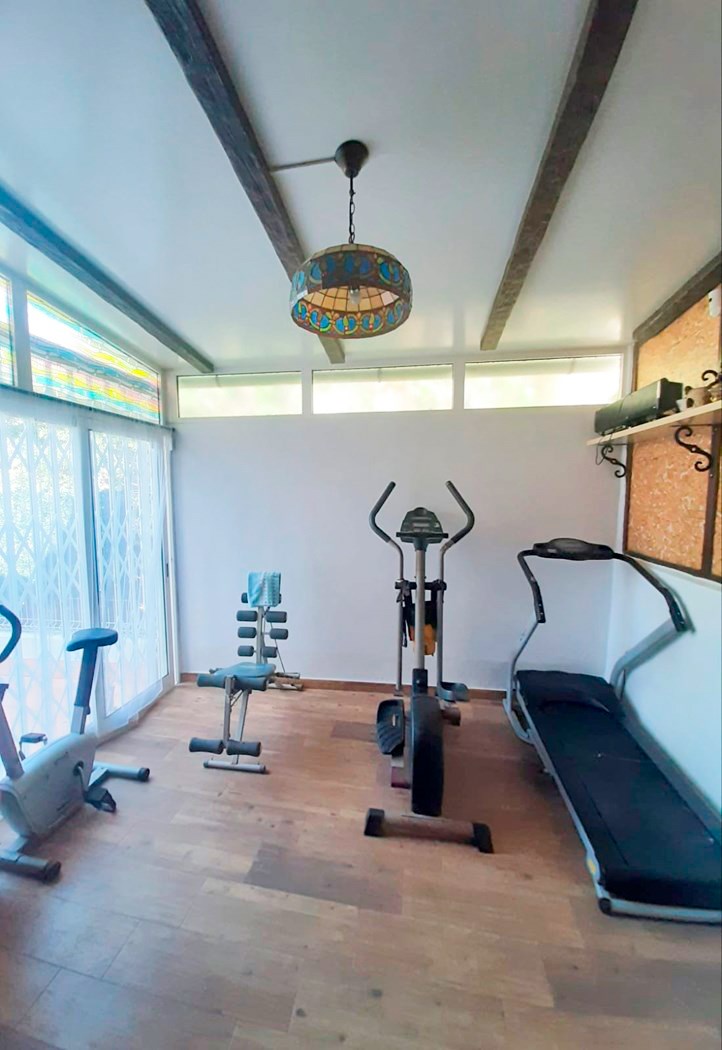 Jardín privado que rodea la vivienda, terraza con barbacoa, garaje y una habitación preparada para gimnasio.