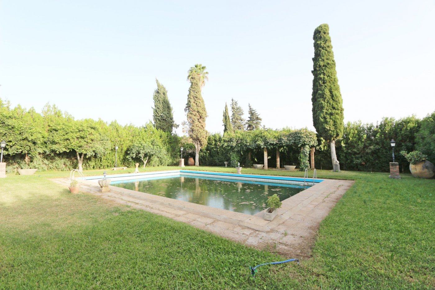 1. La primera y principal: una casa de 250 metros cuadrados distribuida en una única planta. Consta de hall de entrada desde el que se accede a (1) un despacho con una habitación adicional, al (2) salón-comedor con chimenea y acceso al jardín al que rodean 2 habitaciones, 1 baño y un pequeño distribuidor que comunica con otras 3 habitaciones y un baño, y (3) la cocina con office desde la que se accede a un salón de juegos y una bodega. En la parte delantera de la casa, en el jardín, encontramos una piscina privada.