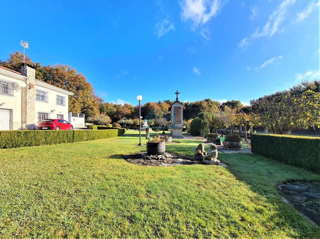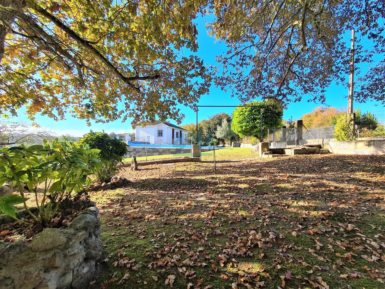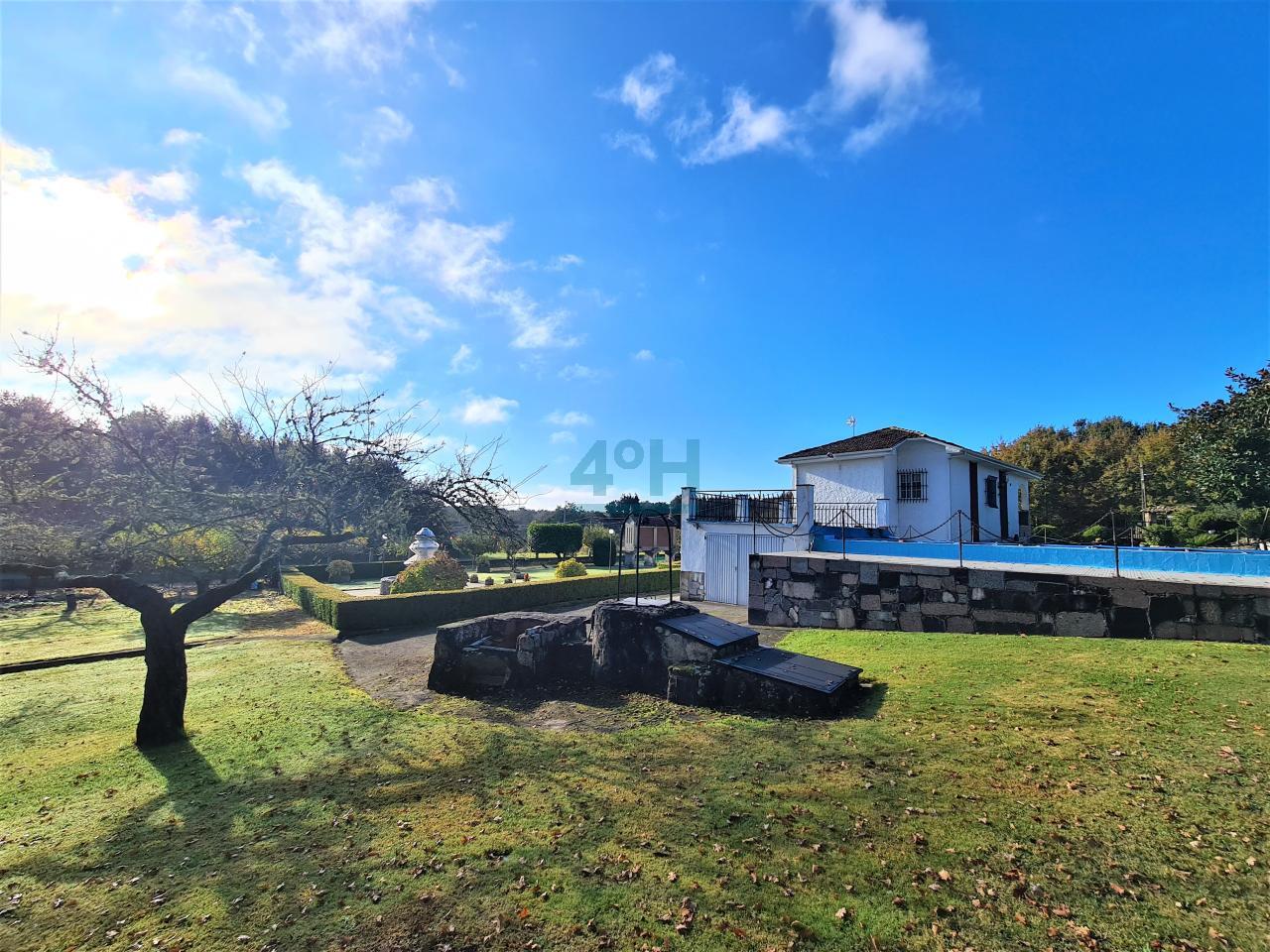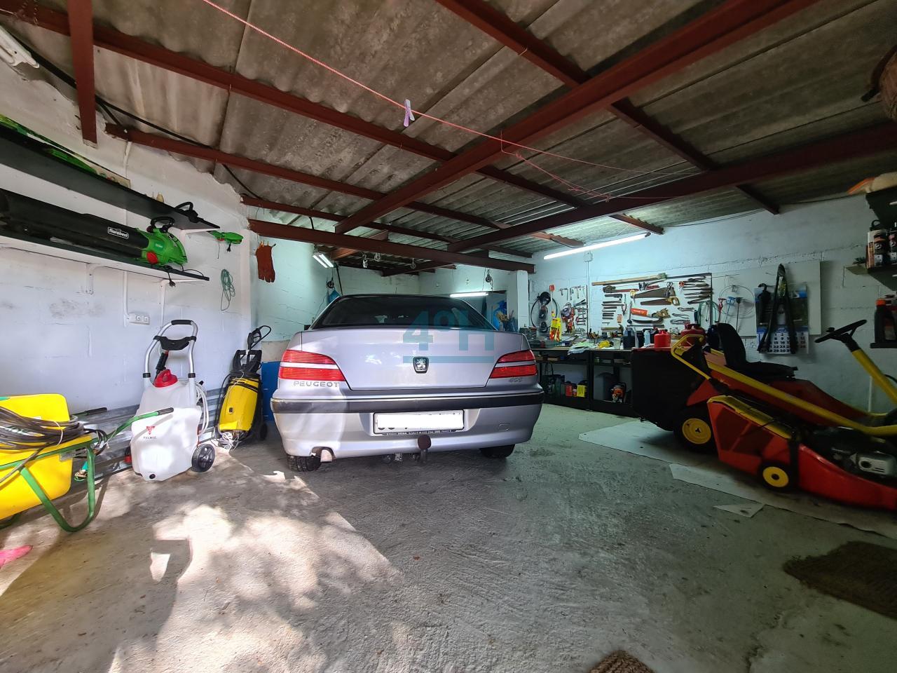 La casa se encuentra ubicada en una finca de 6.500 m2 con riego automático (30 difusores), que cuenta con piscina (con calentador de agua y depuradora ubicados en un galpón de 24 m2), fuente, zona de cenador y barbacoa, dos pozos (uno artesano y otro de barrena) y un galpón de 90 m2 con garaje para dos coches y con zona de almacenamiento para maquinaria.
