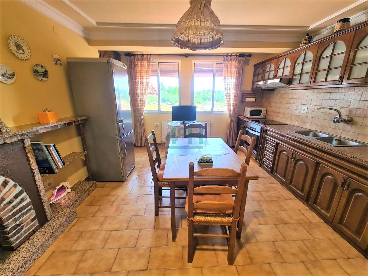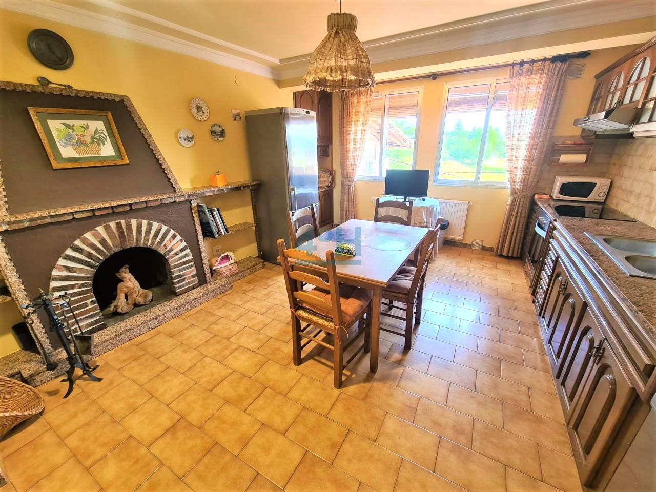 Planta segunda: cocina-comedor con chimenea de leña, baño completo con plato de ducha y dormitorio principal.