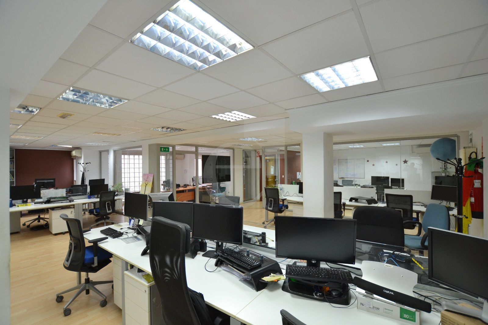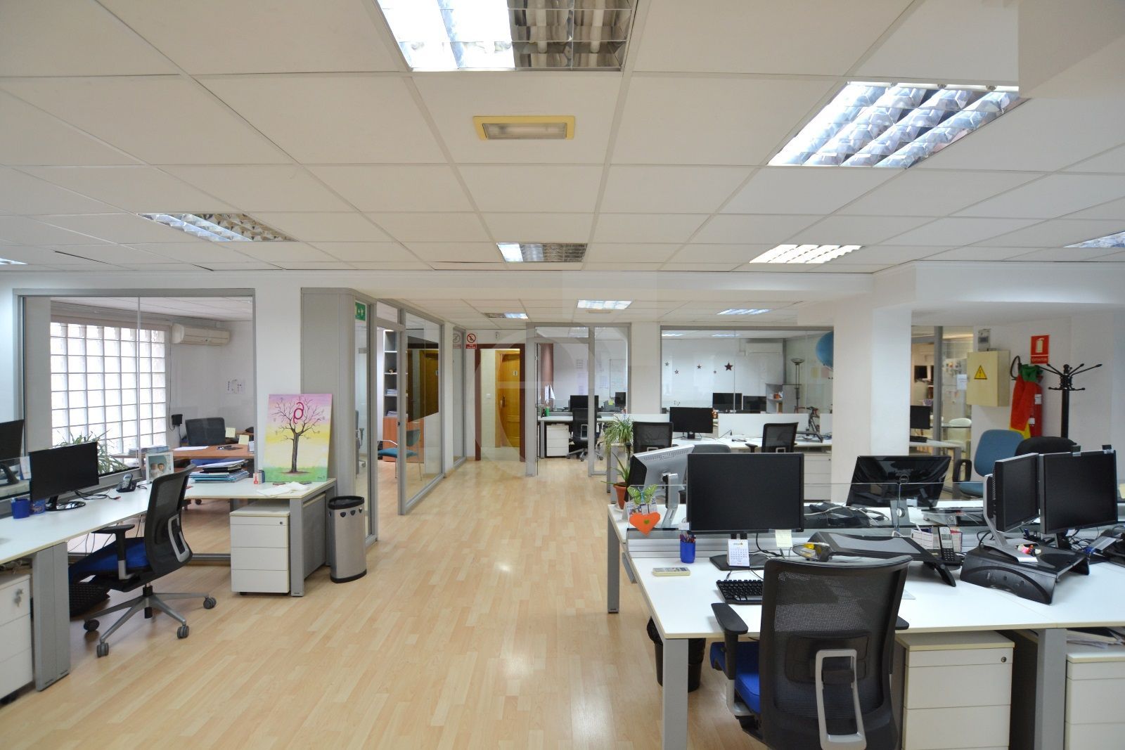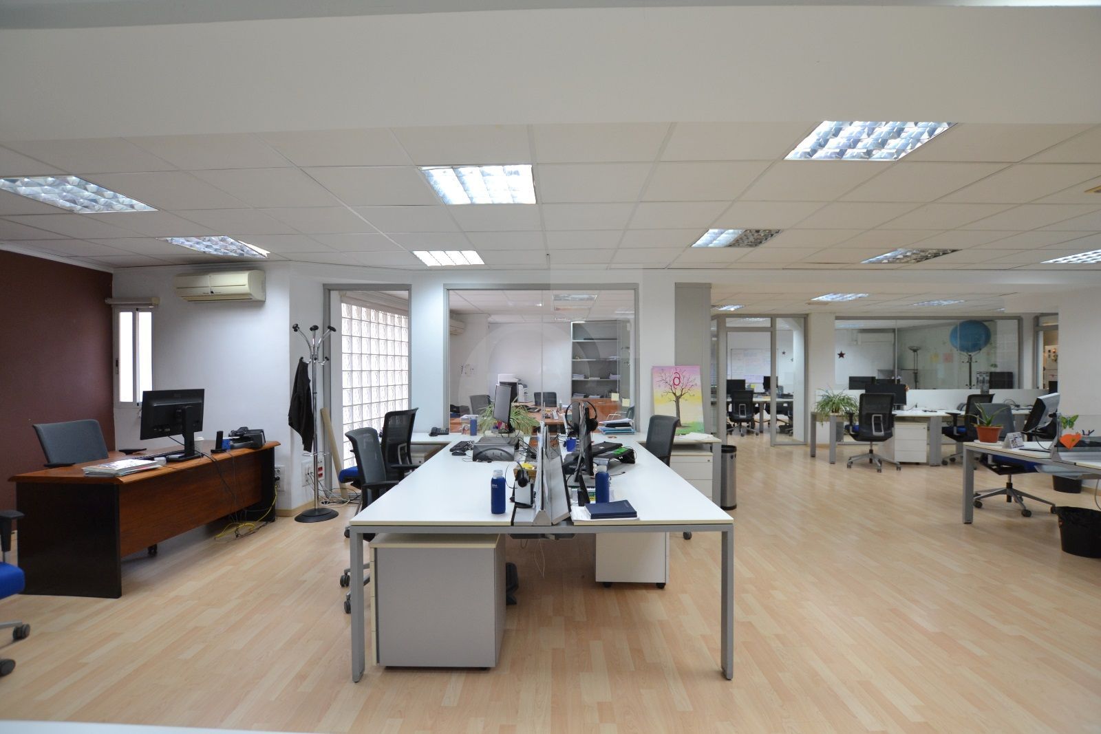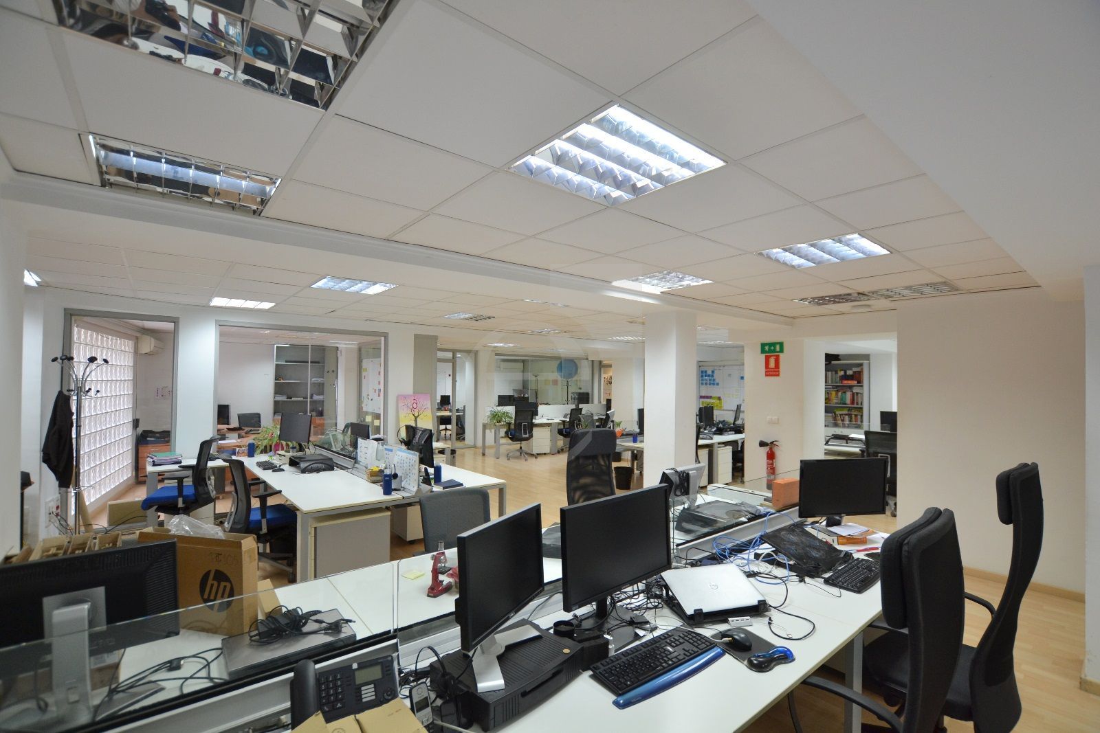 Especificaciones técnicas de la oficina: Techo técnico registrable. Suelo de tarima. Red de voz y datos. Climatización mediante splits.
