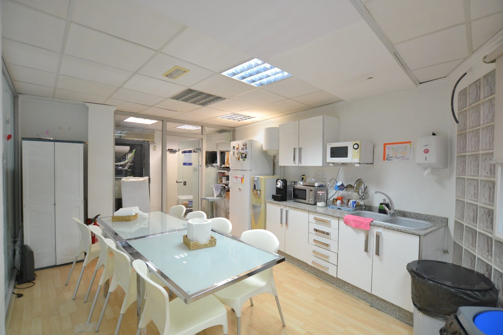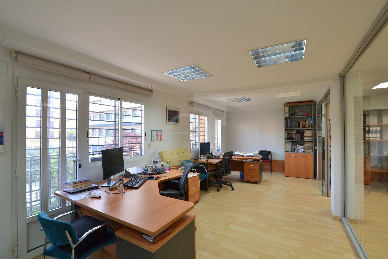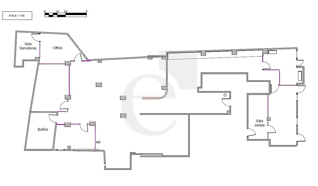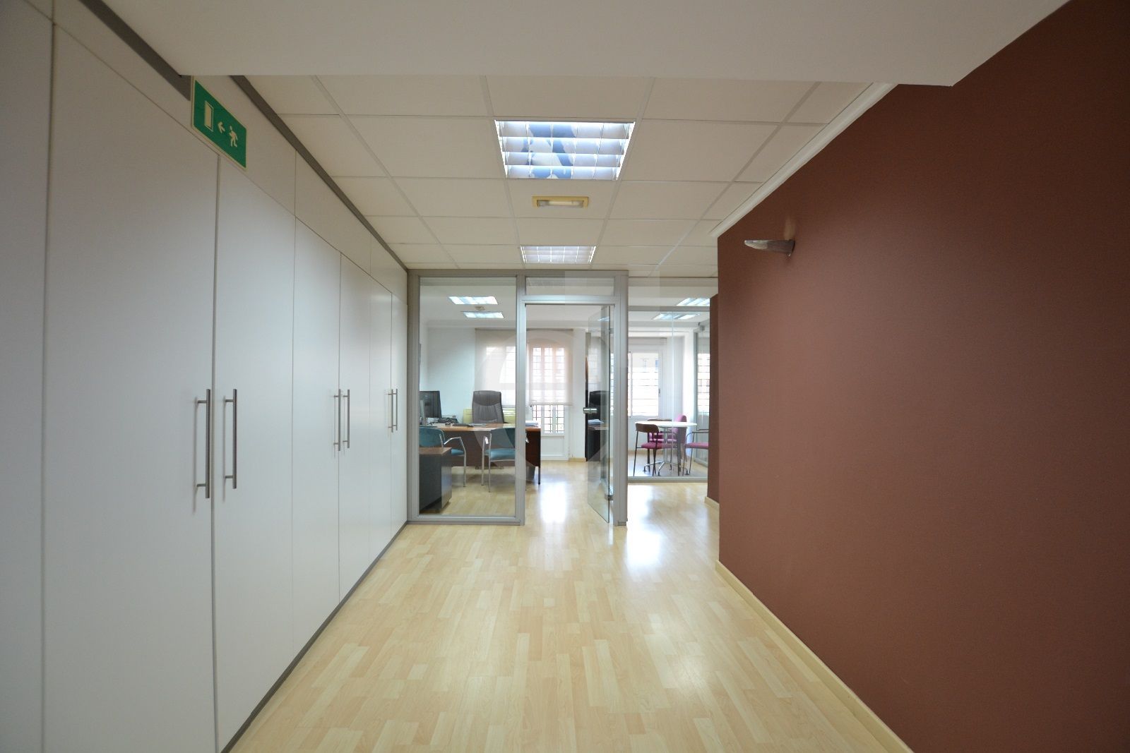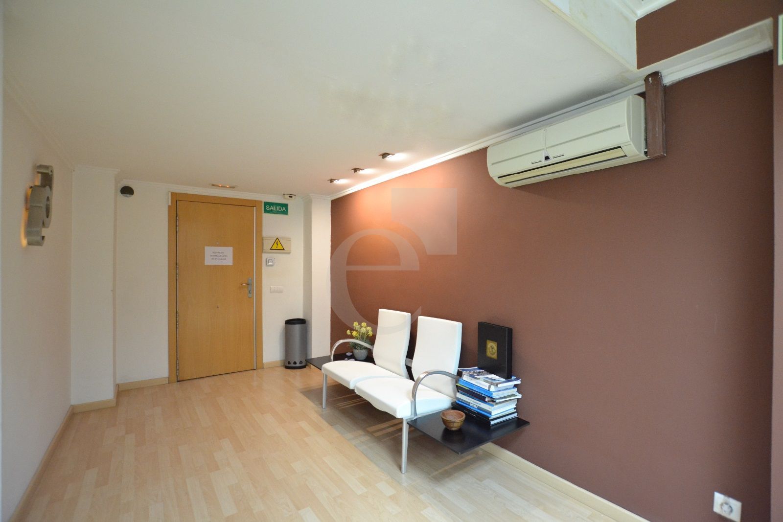 Especificaciones técnicas de la oficina: Techo técnico registrable. Suelo de tarima. Red de voz y datos. Climatización mediante splits.