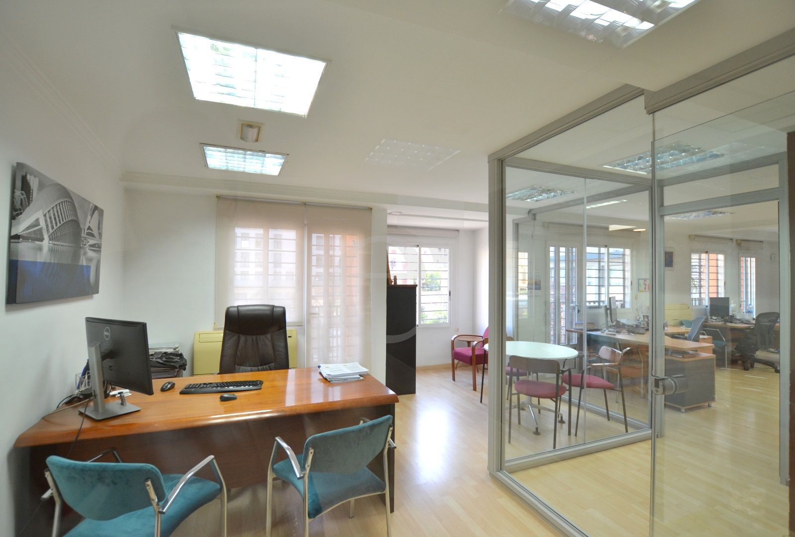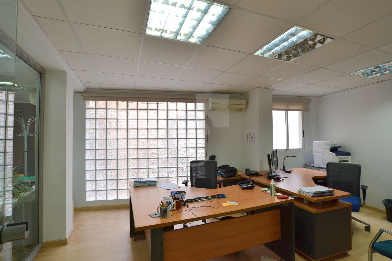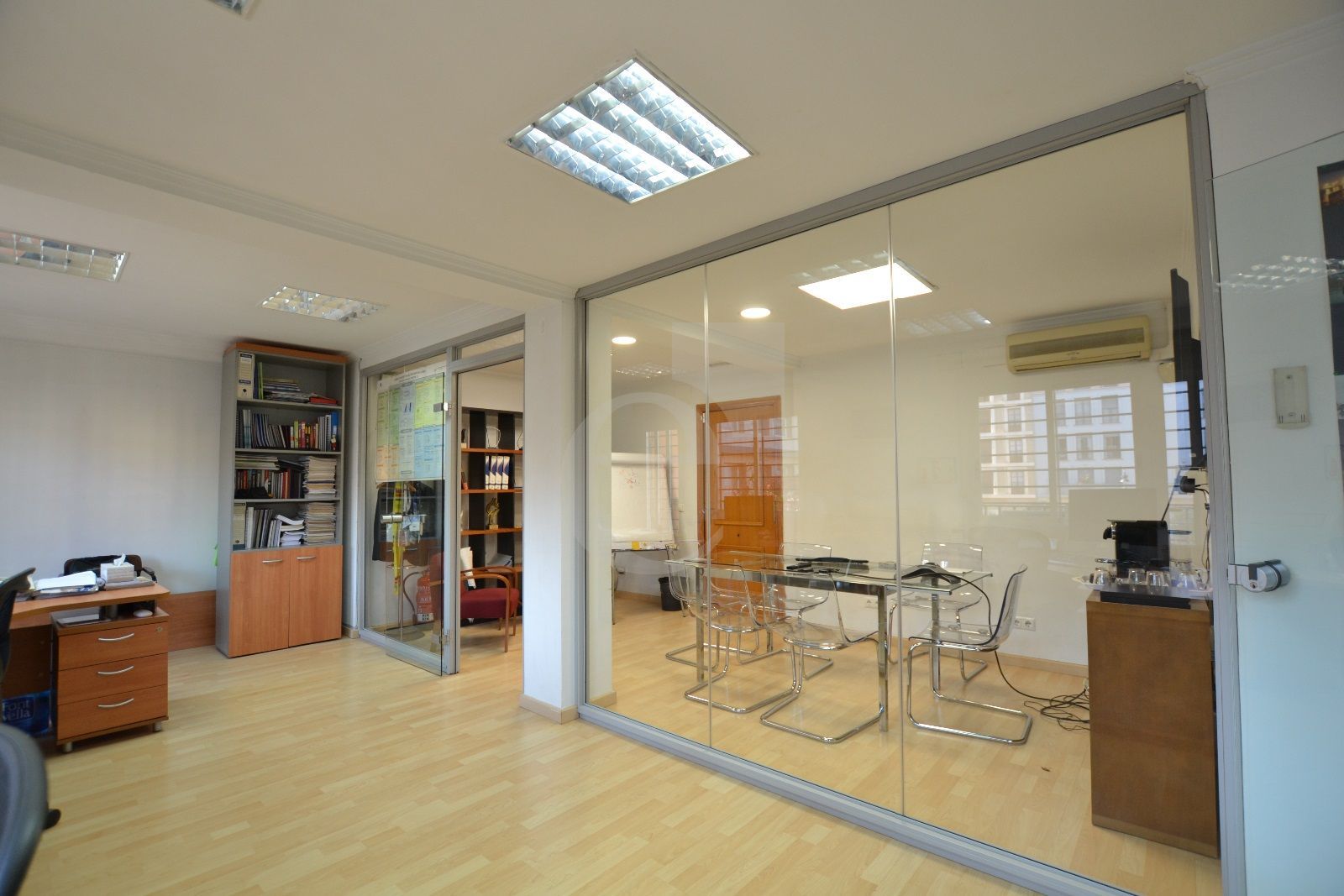 OFICINA EN RENTABILIDAD, CON INQUILINO. Está ubicada en un entresuelo de uso exclusivo de oficinas junto al Mercado Central. La oficina se distribuye en despacho de dirección, dos despachos individuales, sala de juntas, sala de trabajo, un amplio espacio diáfano de trabajo, hall recepción, office y un núcleo de tres aseos. El inmueble está completamente equipado con aire acondicionado frío - calor por splits, falso techo registrable y red de voz y datos con armario rack ventilado y cableado categoría 6.