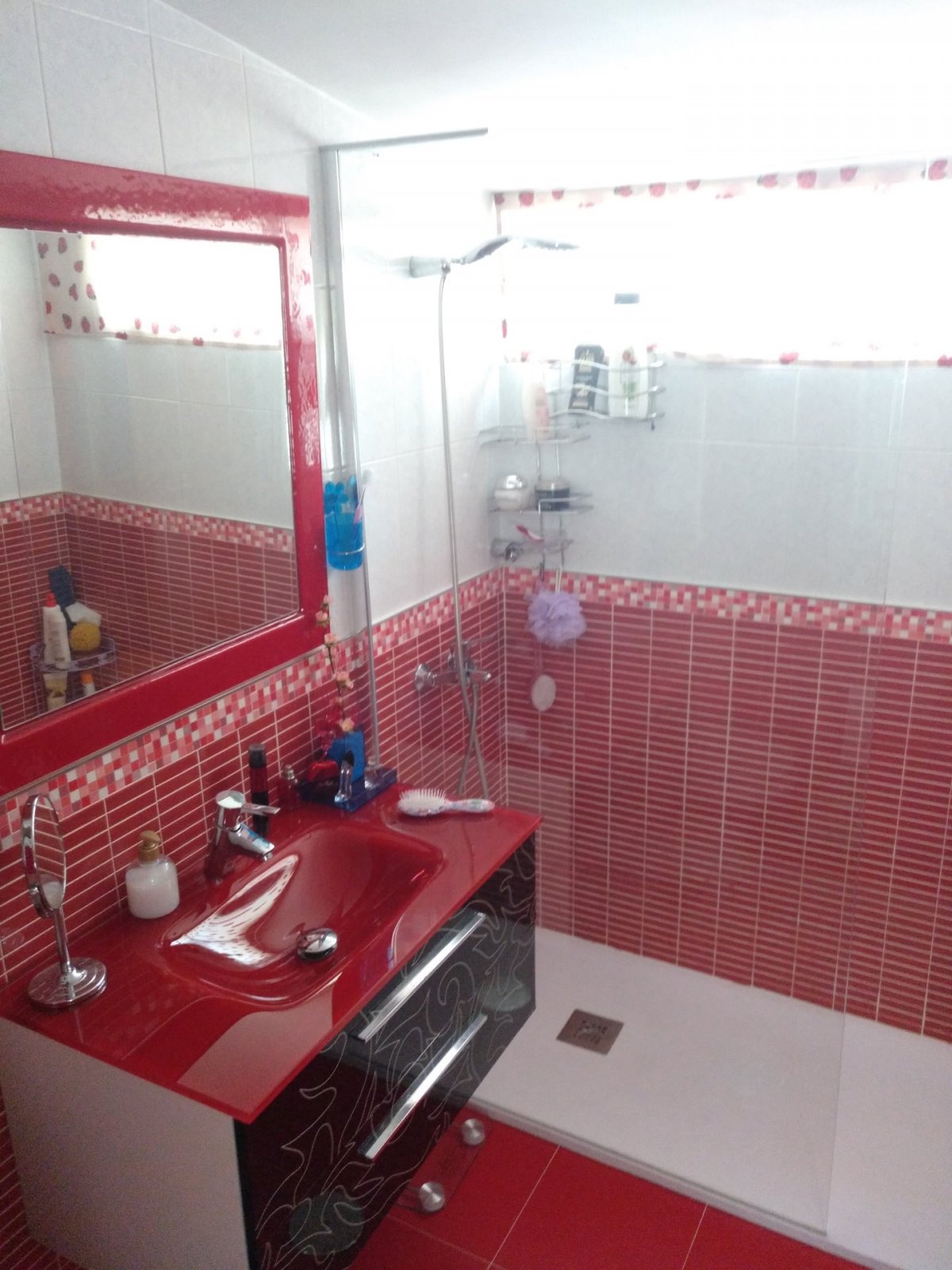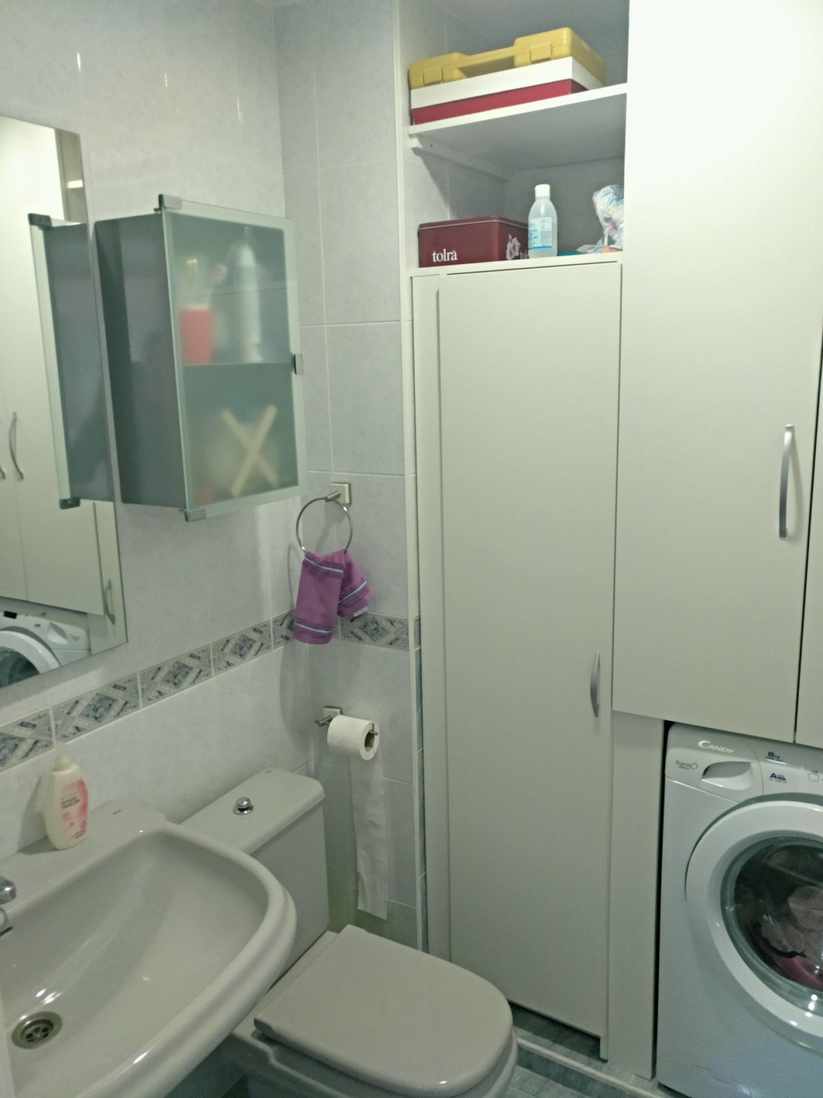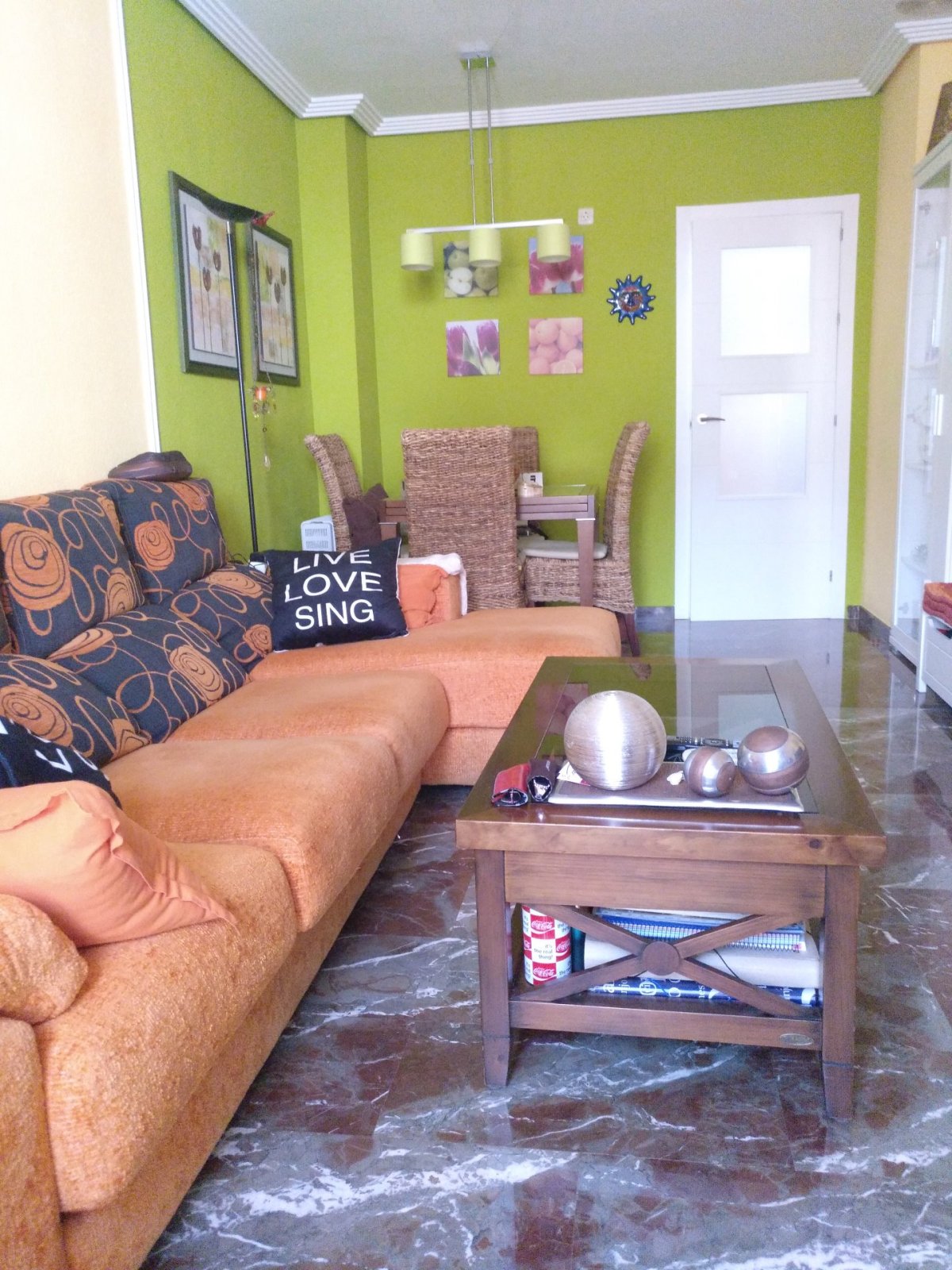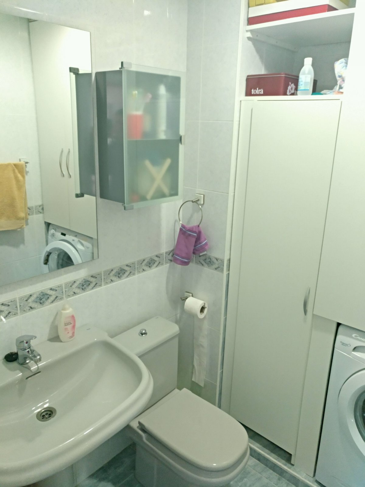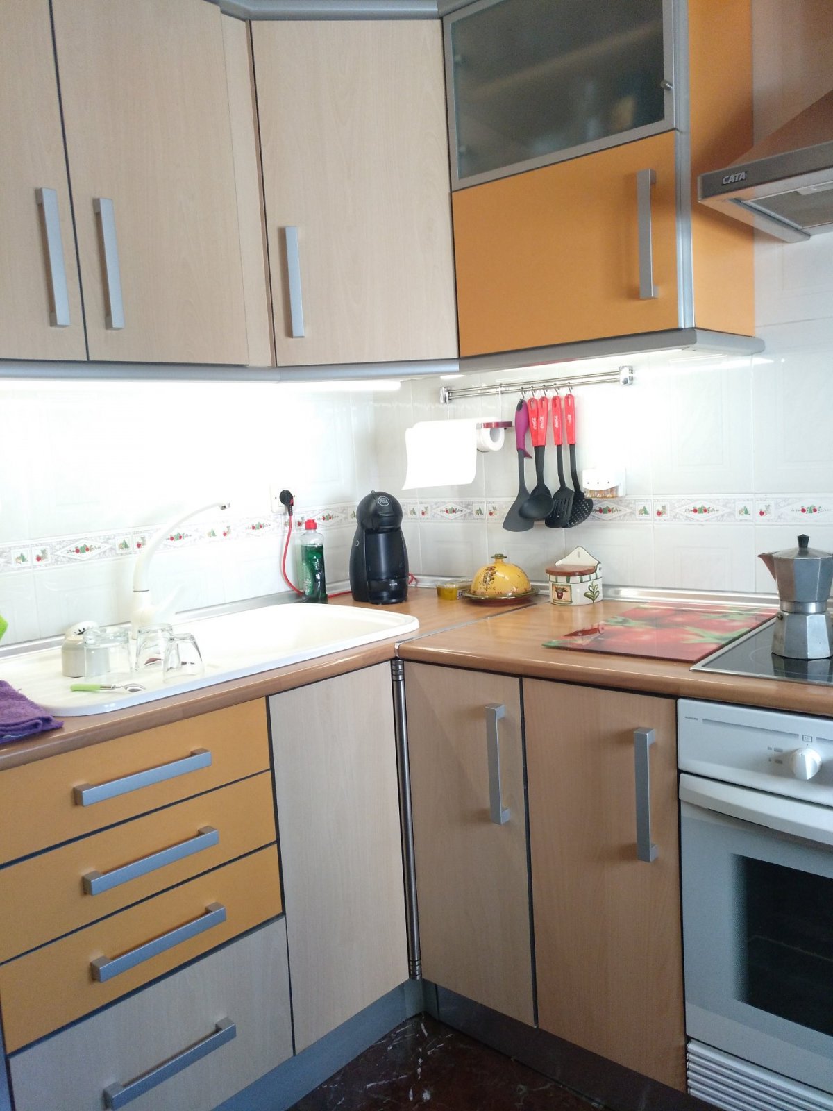 En la primera planta nos encontramos un gran salón exterior, muy luminoso con un pequeño balcón, cocina equipada y amueblada(horno, microondas, lavavajillas, frigorífico, vitrocerámica y extractor)con bastante sitio de almacenajebajo el hueco de la escalera, y un aseo donde encontramos una lavadora.