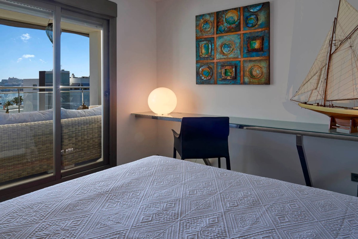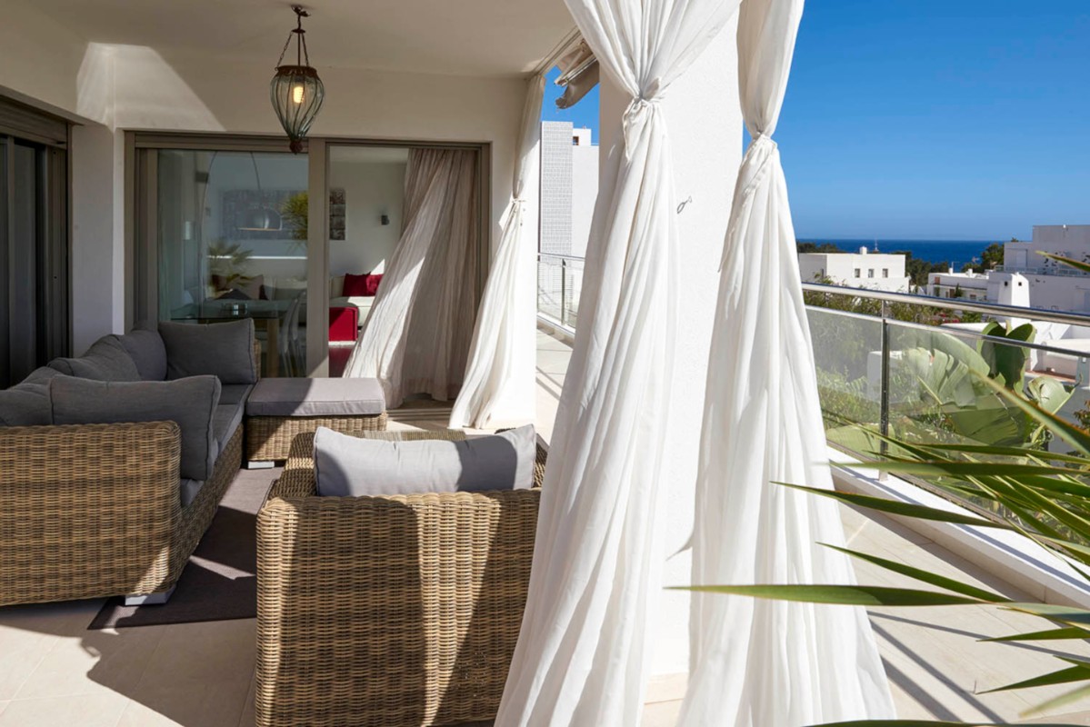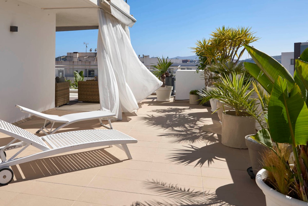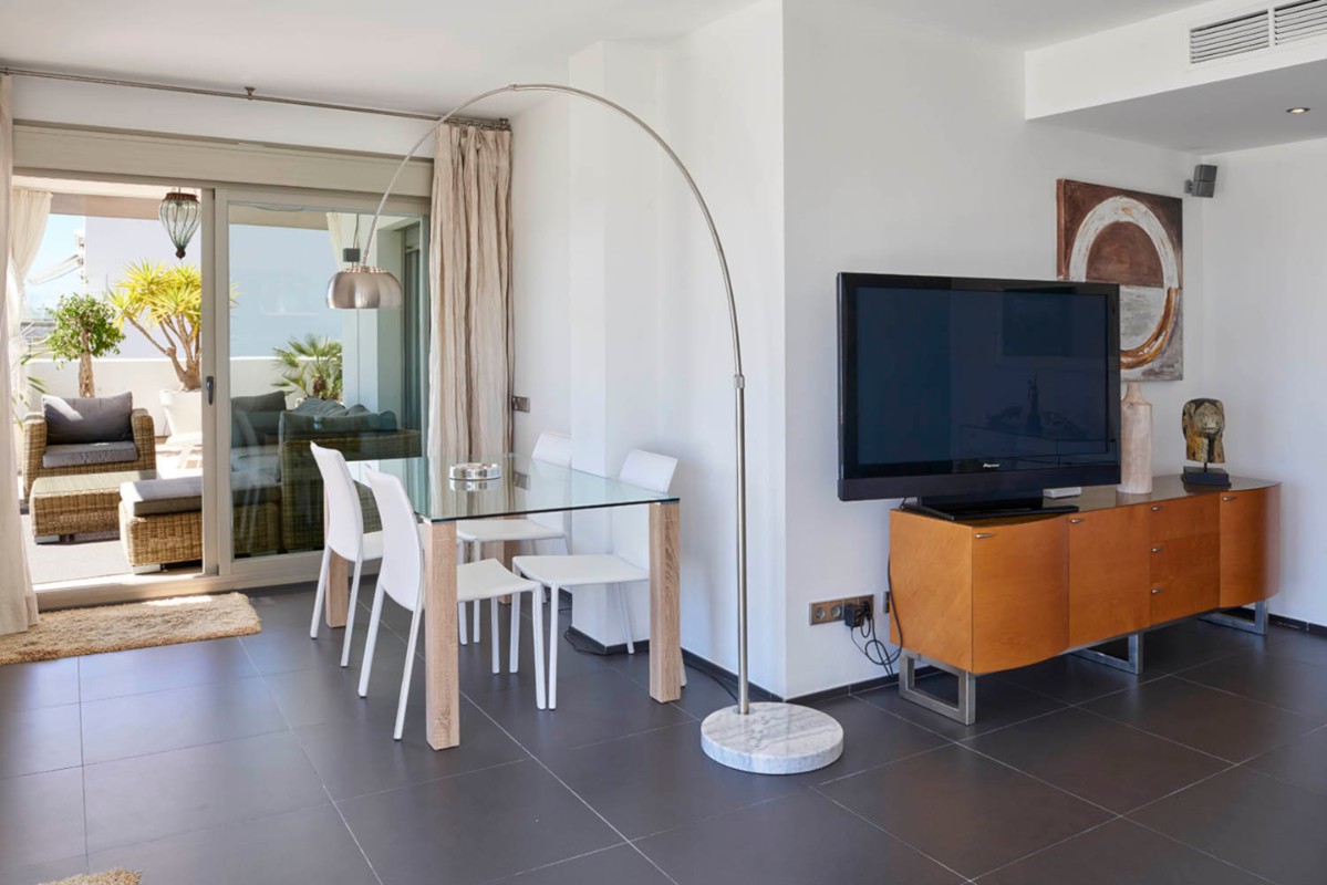 Lujoso y moderno apartamento situado a tan sólo 100 metros de la playa. Terraza con chill-out de 83,5 m2 muy privada. El edificio se construyó en 2008 y el piso ha sido decorado con el más alto nivel de calidad y buen gusto. Todas las estancias son exteriores y dan acceso a la terraza donde podremos disfrutar de las vistas al mar, incluso desde el salón. El dormitorio principal es muy espacioso ya que se eliminó el tercer dormitorio que anteriormente tenía la vivienda dando más capacidad al dormitorio, al baño en suite y al vestidor. Incluye garaje para coche grande y un trastero.