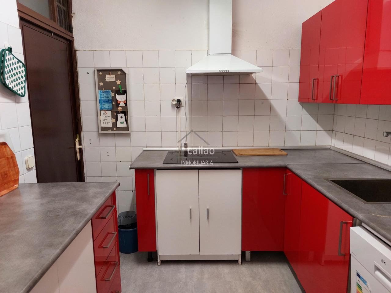 Tiene una cocina amueblada con electrodomésticos de bonitos tonos y un lavadero donde se encuentra la lavadora y baldas para almacenaje.