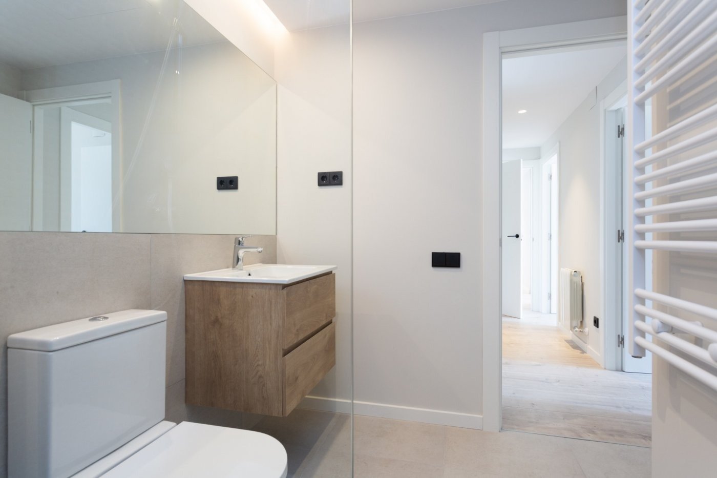- Baños equipados con grifería Hansgrohe y sanitarios Roca.